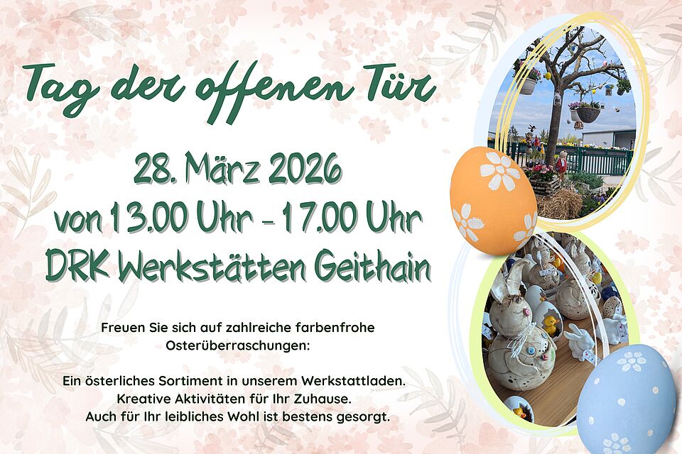 Am 28. März 2026 öffnen wir in der Zeit von 13.00 Uhr bis 17.00 Uhr unsere Tore und Türen für Sie und laden Sie herzlich in unsere DRK Werkstätten Geithain ein.